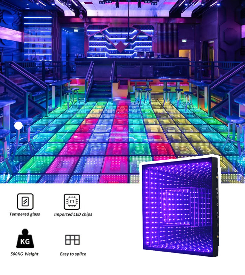Nested Double 3D LED Dance Floor is available in two standard sizes: 50cm and 60cm. It supports power cord connection or magnet splicing.