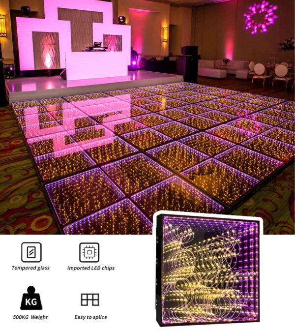 A 3D Starlit Dance Floor combines fixed star-point LEDs with an infinity mirror or 3D LED base to produce both starry twinkles and deep reflective depth. It’s designed for weddings, quinceañeras, and high-impact event productions.
